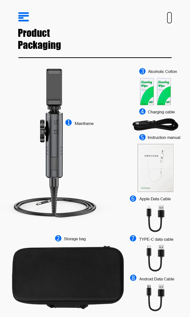 Equipado com bateria recarregável de até 3000 mAh, oferecendo 4 a 5 horas de uso contínuo. Tudo vem organizado em um estojo resistente e portátil, tornando o trabalho de inspeção mais rápido e eficiente.